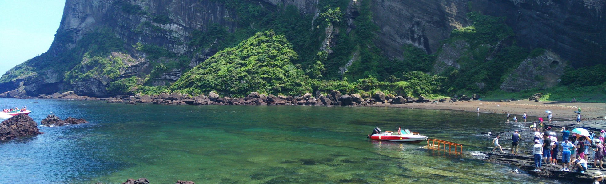 Скала Ендуам – это скала, образованная путем извержения вулкана около 2 миллионов лет тому назад. Ее высота составляет 10 метров, а длина – 30 метров. Происхождение названия скалы связано с легендой о том, что дракон (по-корейски «ен») пытался вознестись на небеса, однако его попытки оказались тщетными, и он остался в своем месте обитания. Очертания скалы напоминают форму головы дракона, поэтому ее назвали Ендуам (скала дракона). В настоящее время скала имеет только часть, напоминающую тело дракона, потому что относительно недавно во время сильного шторма головная часть скалы была поражена молнией и отвалилась. Приблизительно на расстоянии 20 метров на восток от Ендуам находится пруд дракона Еньен. Пруд получил такое название, потому что, согласно легенде, дракон часто обитал здесь. Вода в пруду настолько чистая и прозрачная, что можно увидеть дно.