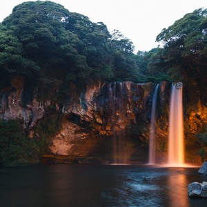 Водопад Чхонджиен находится на южном побережье острова Чеджу, рядом с городом Согвипхо. Название водопада говорит о том, что он соединяет небо («чхон») и землю («джи»). Его внешний вид сильно зависит от времени года. Весной водопад представляет собой своеобразный каскад из нескольких водопадов, струи которых падают в искусственный пруд. Высота водопада составляет 22 метра, а ширина – 12 метров. По древнему обычаю, жених должен перенести невесту на спине через реку, вытекающую из водопада, по переходу из вулканических камней.